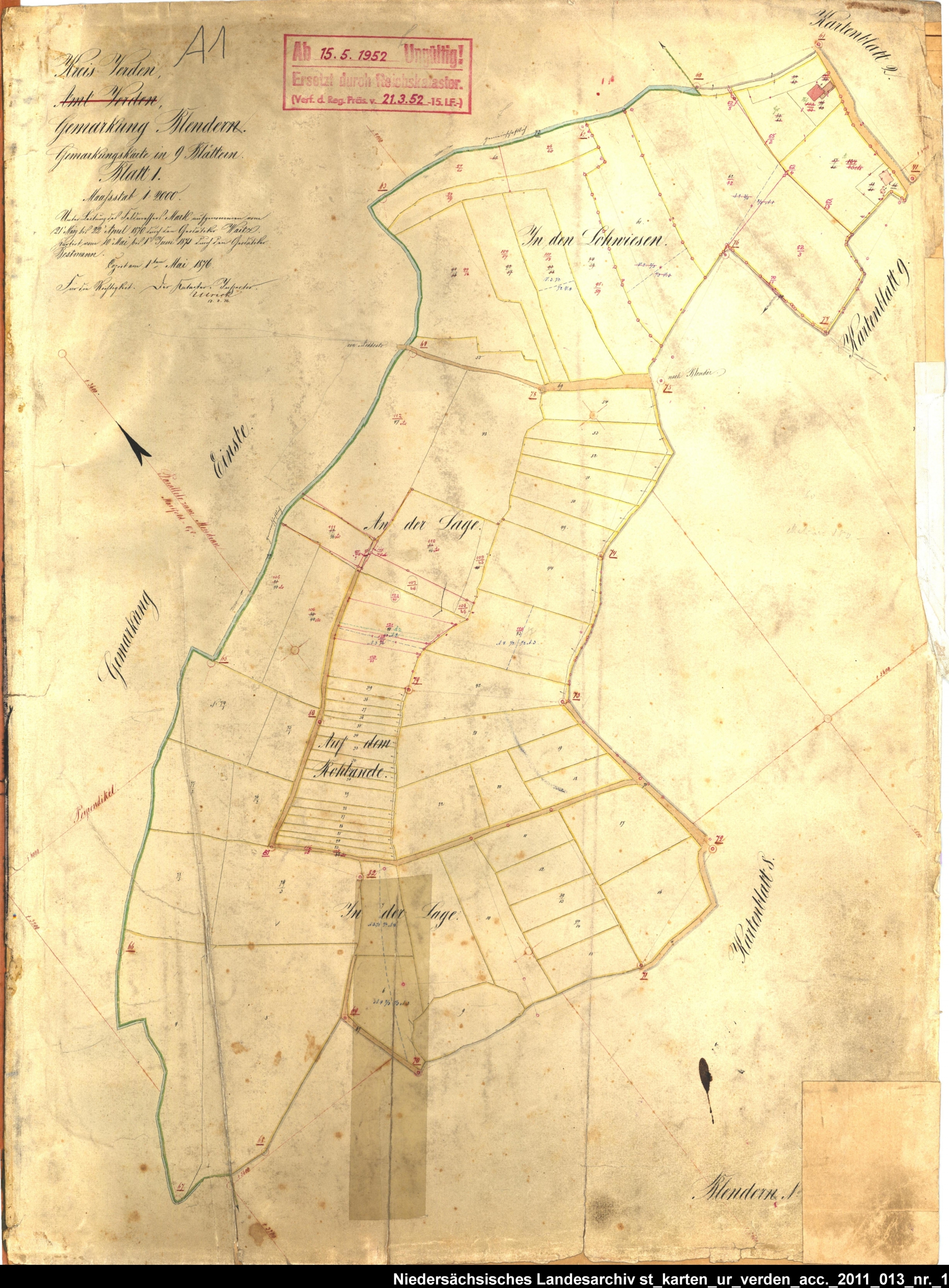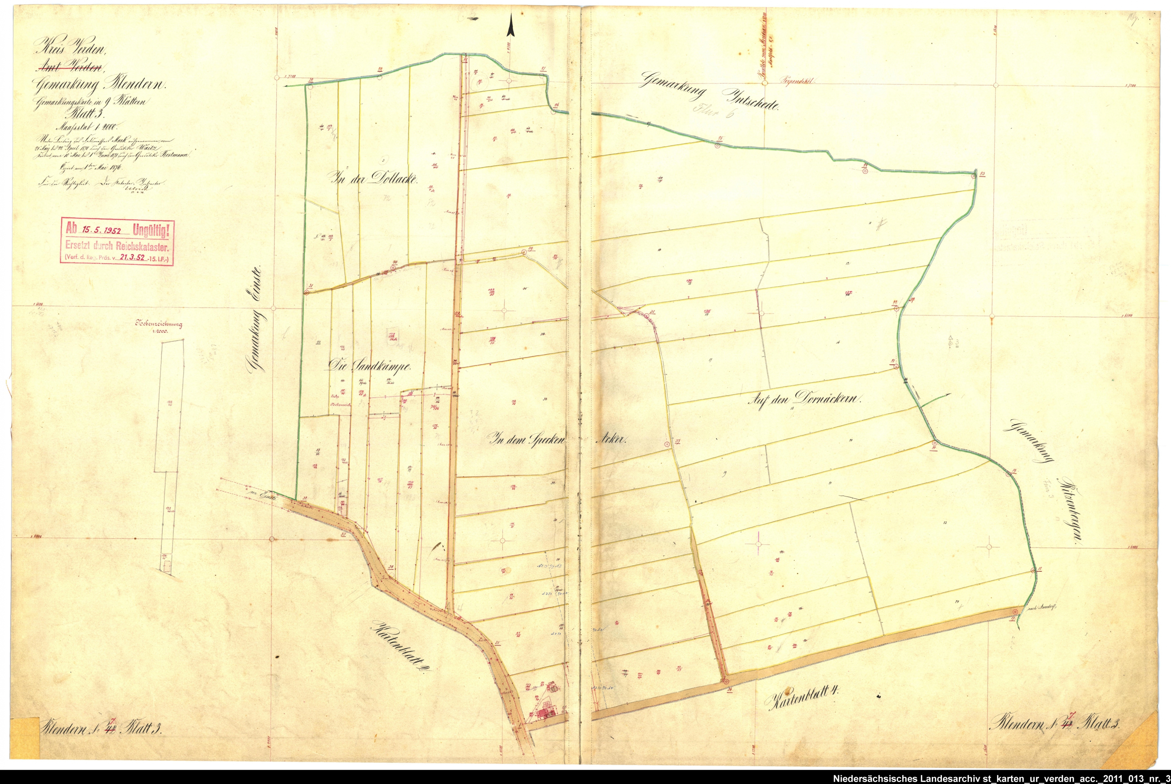 Es handelt sich um die Reinkarte des Katasteramtes Verden (zugehörig zur GLL Verden, jetzt LGLN – Regionaldirektion Verden). Im Gegensatz zur Urkarte wurden in der Reinkarte über viele Jahre Veränderungen eingetragen, wie z. B. wegfallende Grenzen, Grenzzeichen und Parzellennummern. Diese wurden in roter Tusche gekreuzt/gestrichen, neue in rot hinzugefügt. Zur besseren Zuordnung der einzelnen Blätter habe ich die entsprechende Gebiete auf einer älteren Übersichtskarte markiert.