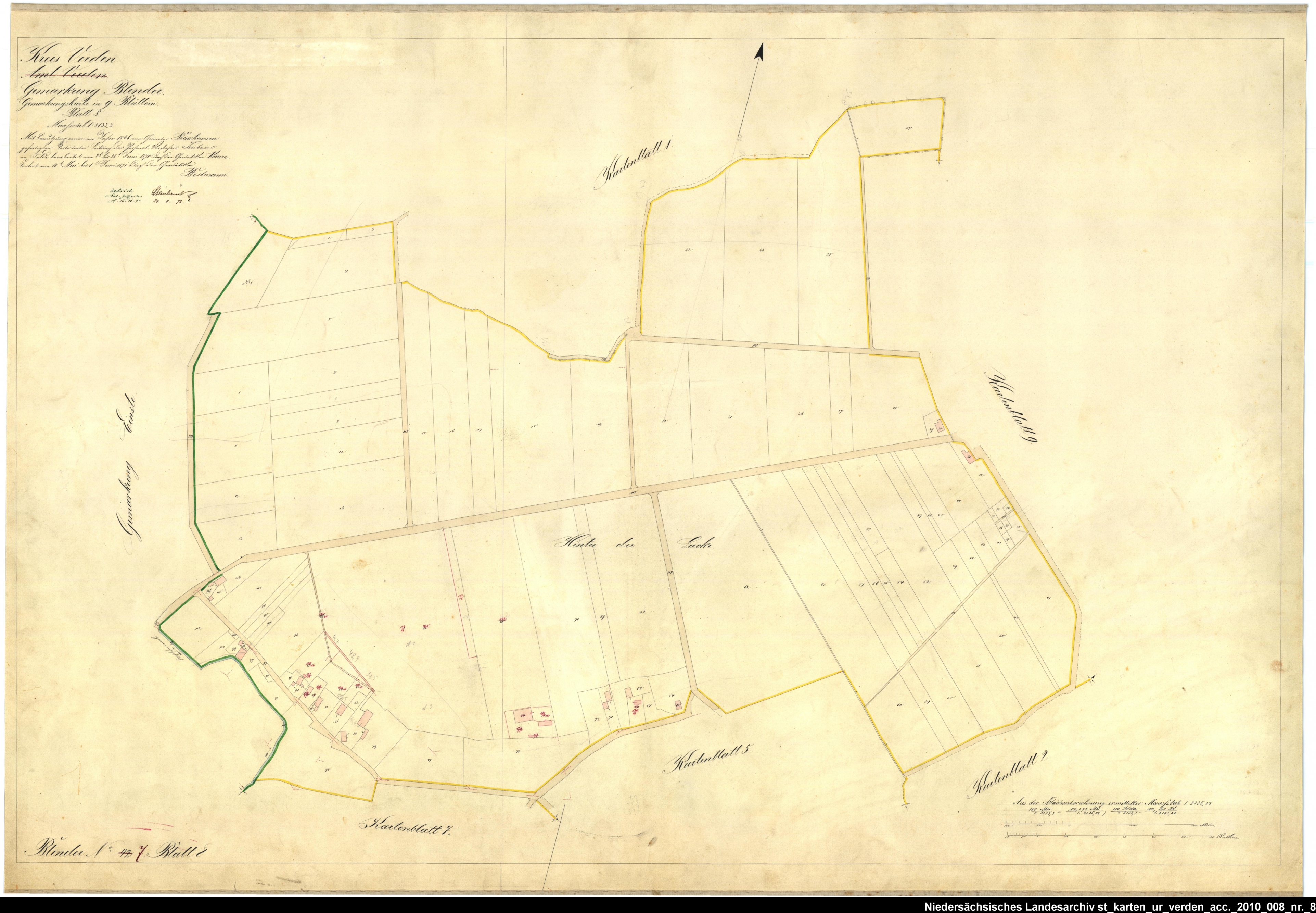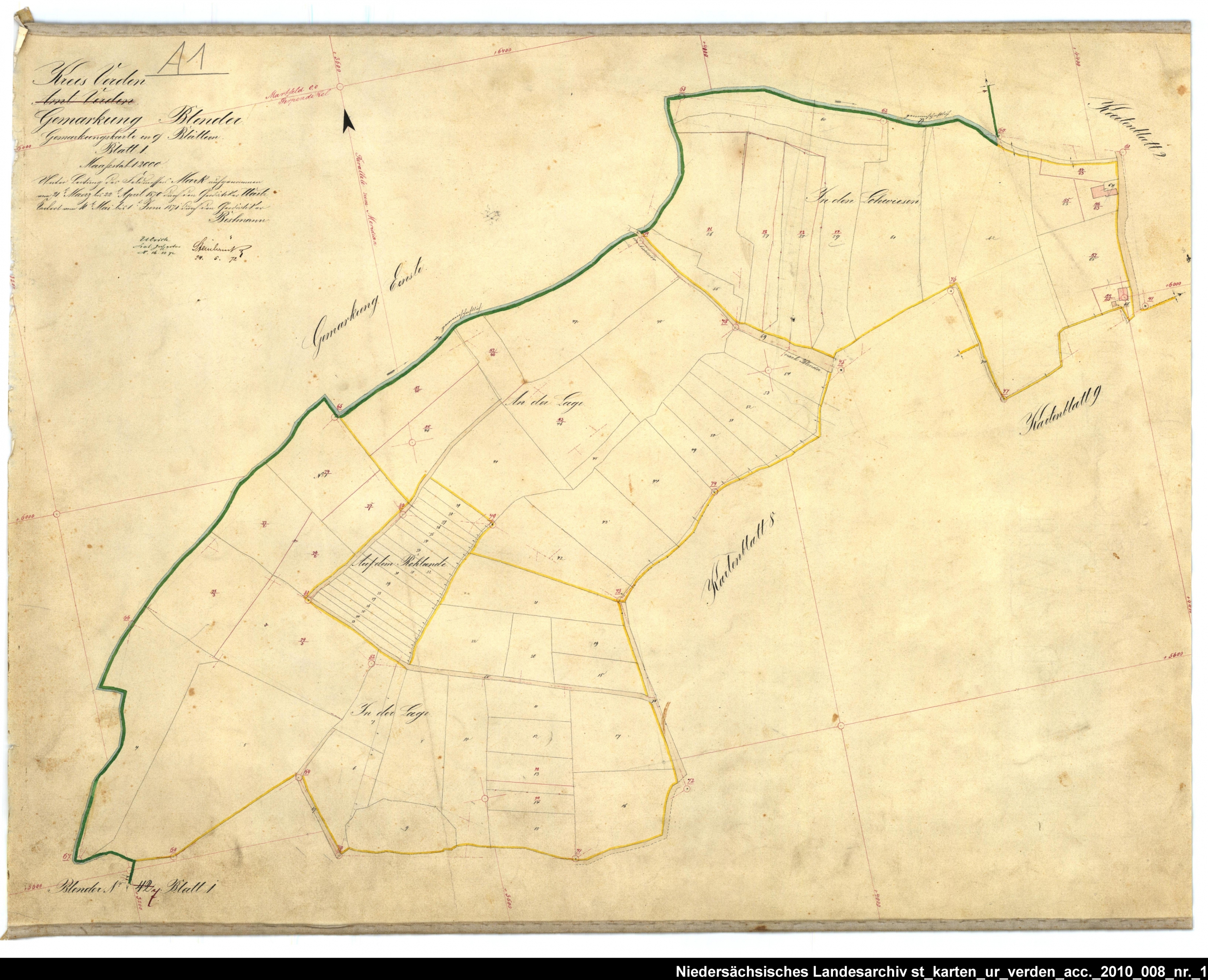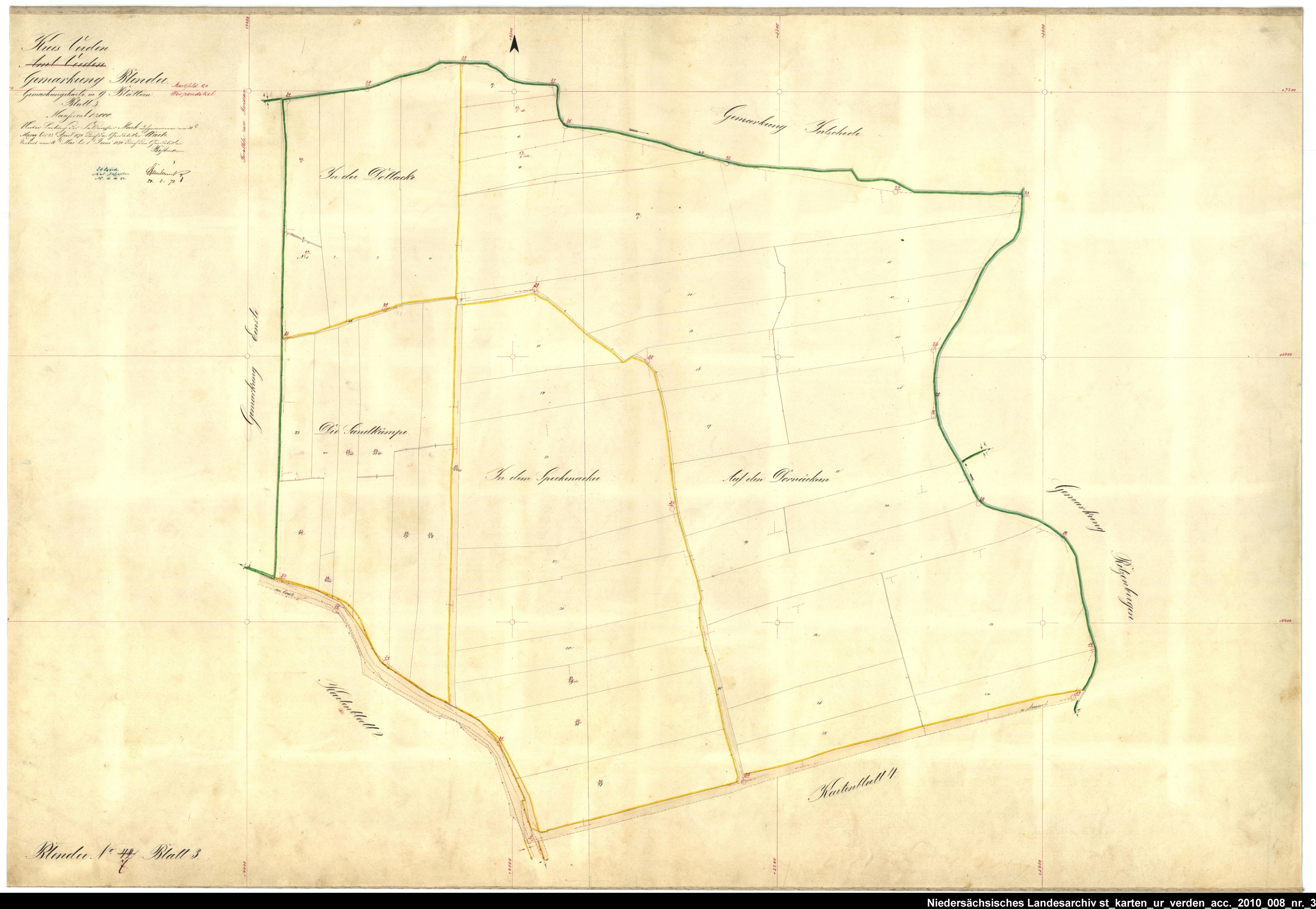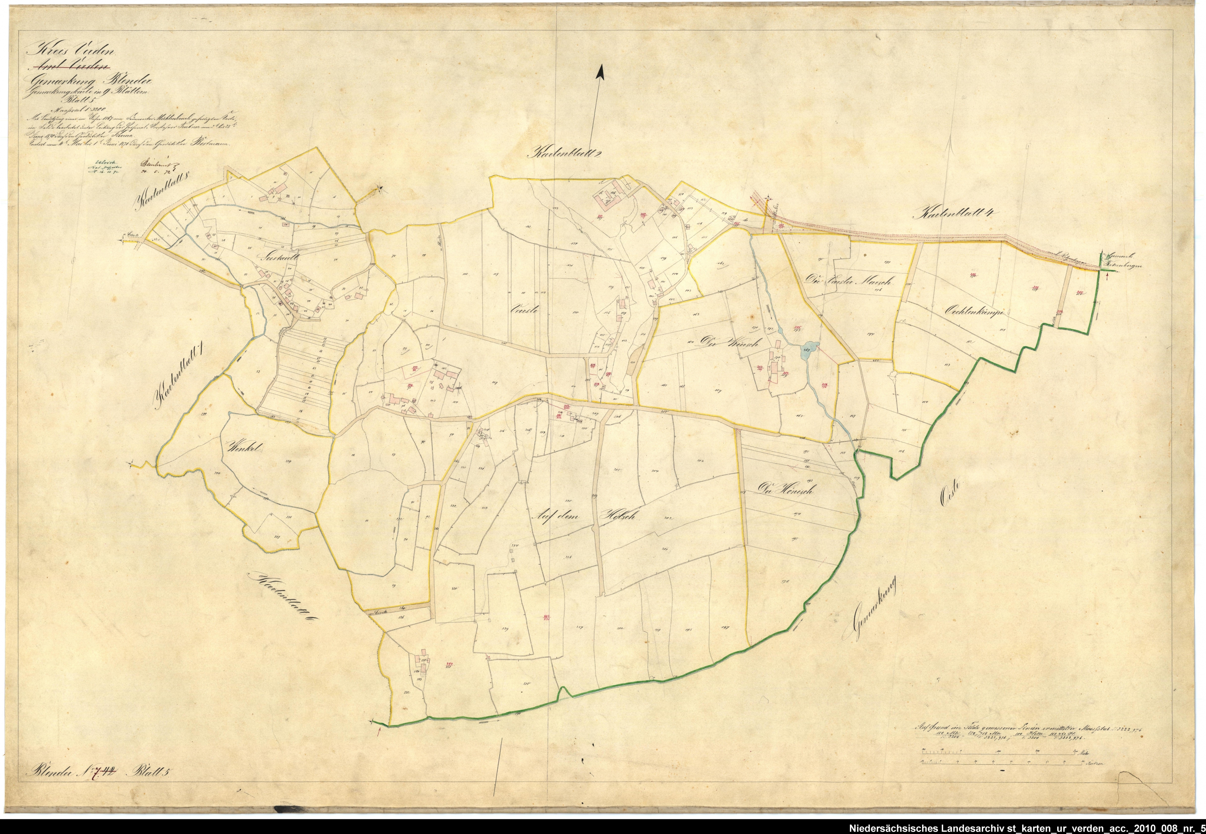 Es handelt sich um die Urkarte des Katasteramtes Verden (zugehörig zur GLL Verden, jetzt LGLN – Regionaldirektion Verden). Die einzelnen Blätter wurden vom 21. März bis 22. April 1870 erstellt. Zur besseren Zuordnung der einzelnen Blätter habe ich die entsprechende Gebiete auf einer älteren Übersichtskarte markiert.