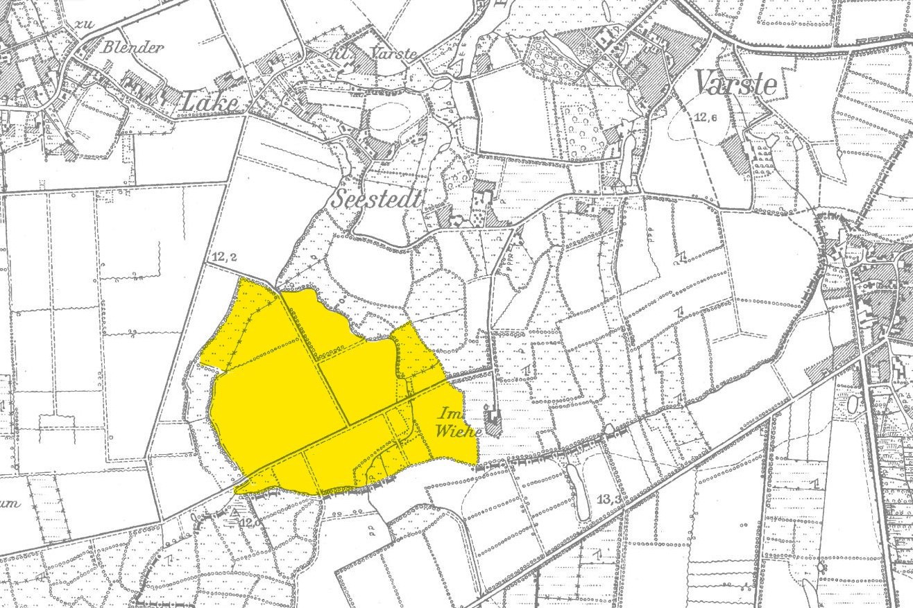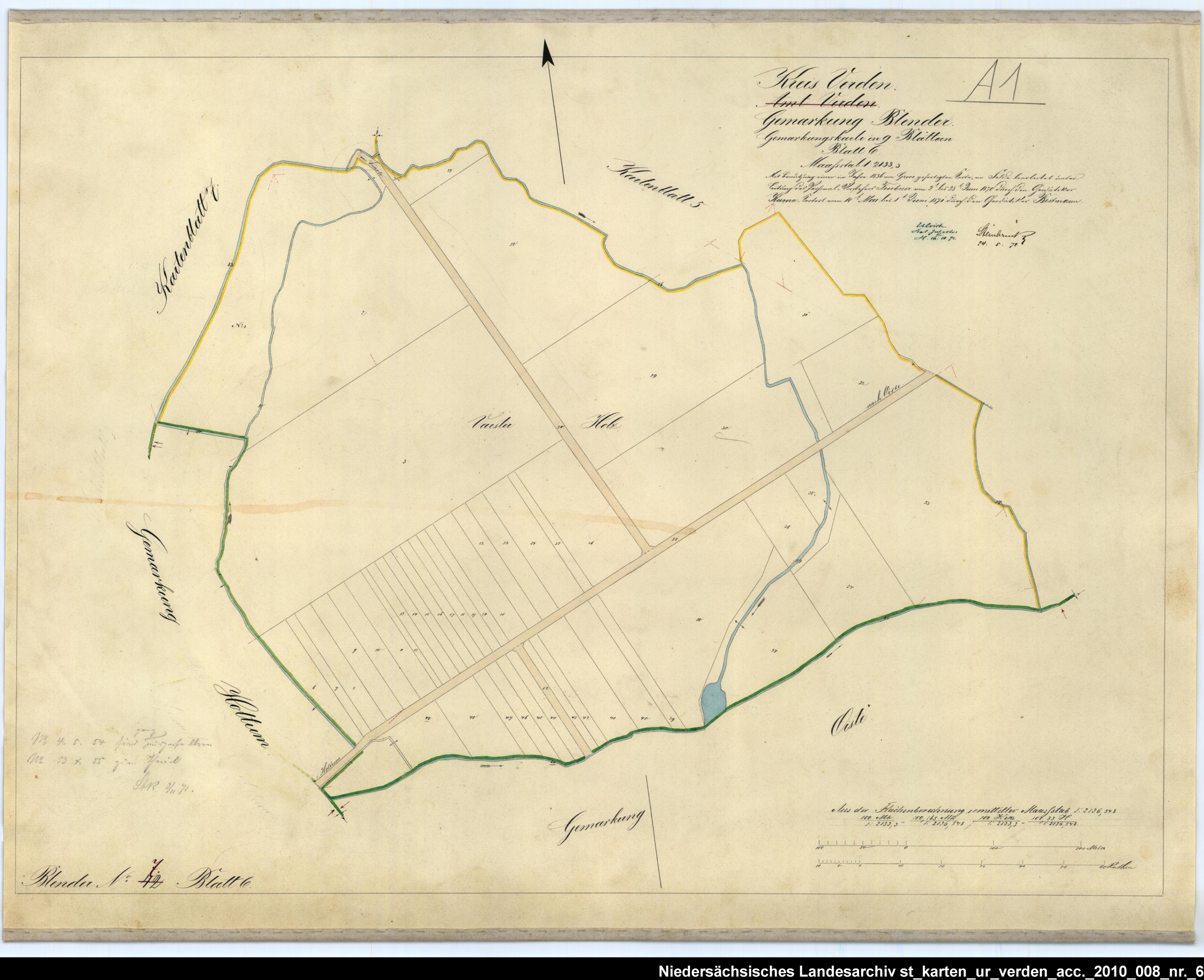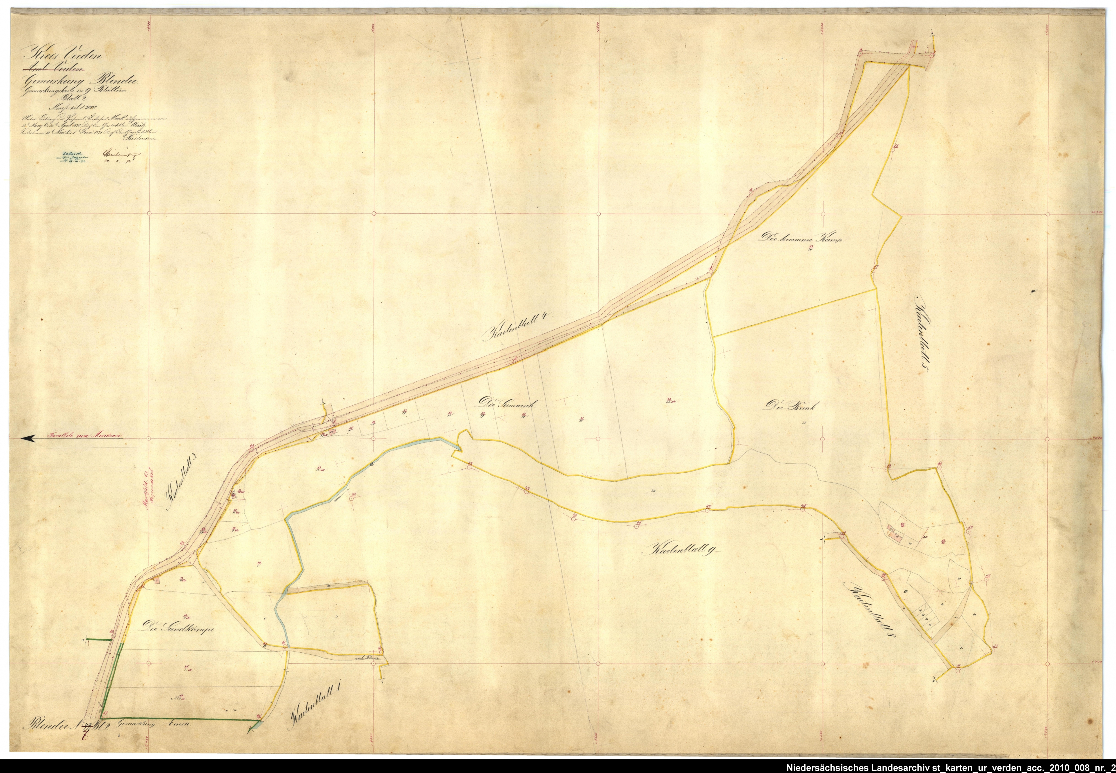 Es handelt sich um die Urkarte des Katasteramtes Verden (zugehörig zur GLL Verden, jetzt LGLN – Regionaldirektion Verden). Die einzelnen Blätter wurden vom 21. März bis 22. April 1870 erstellt. Zur besseren Zuordnung der einzelnen Blätter habe ich die entsprechende Gebiete auf einer älteren Übersichtskarte markiert.