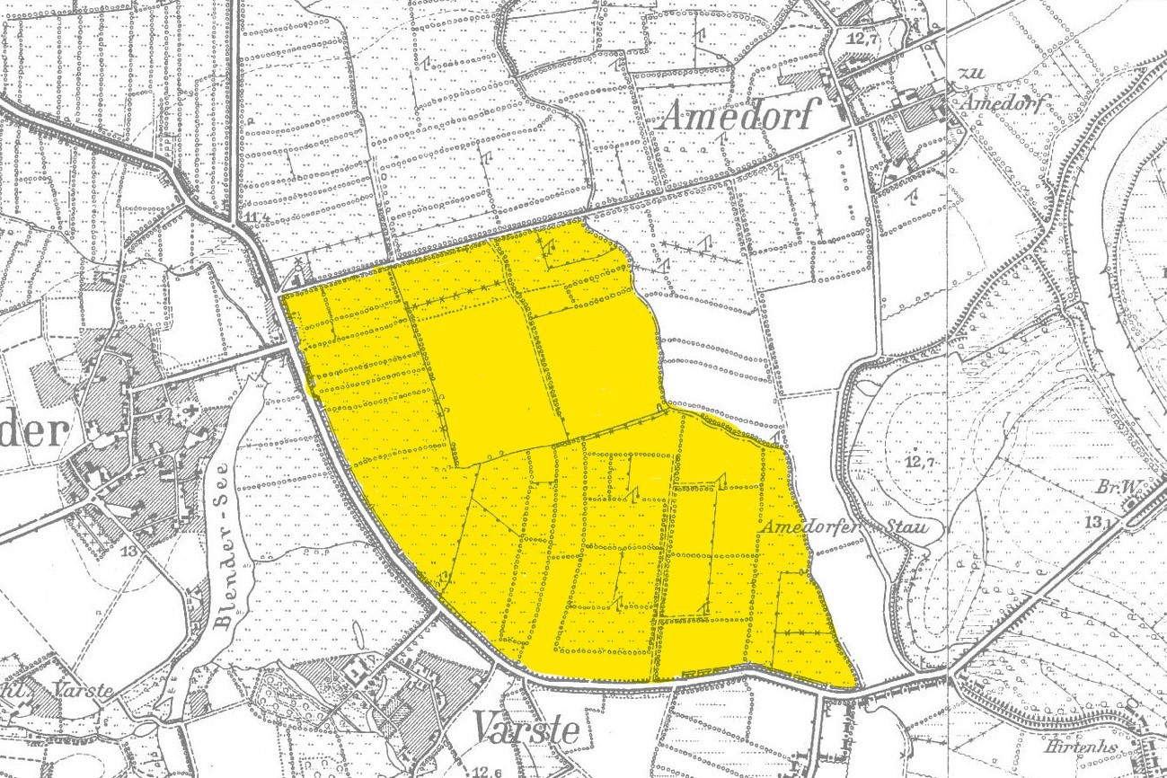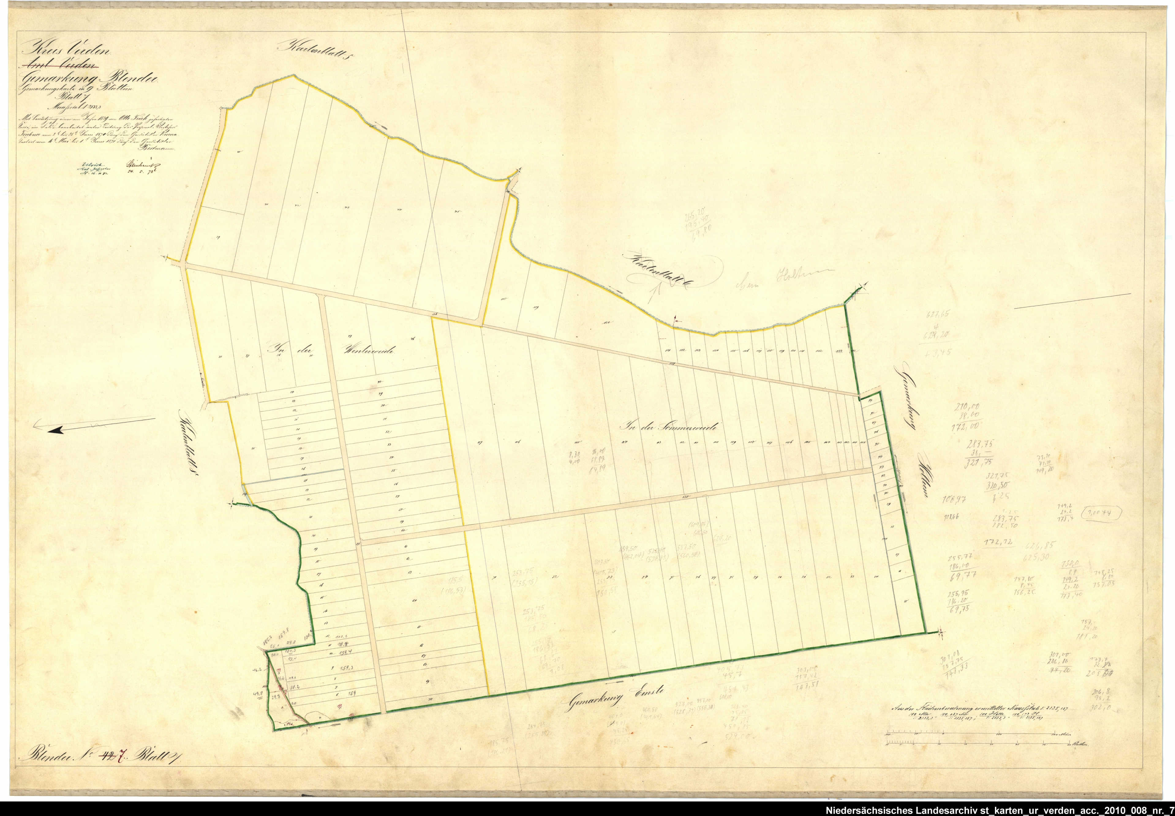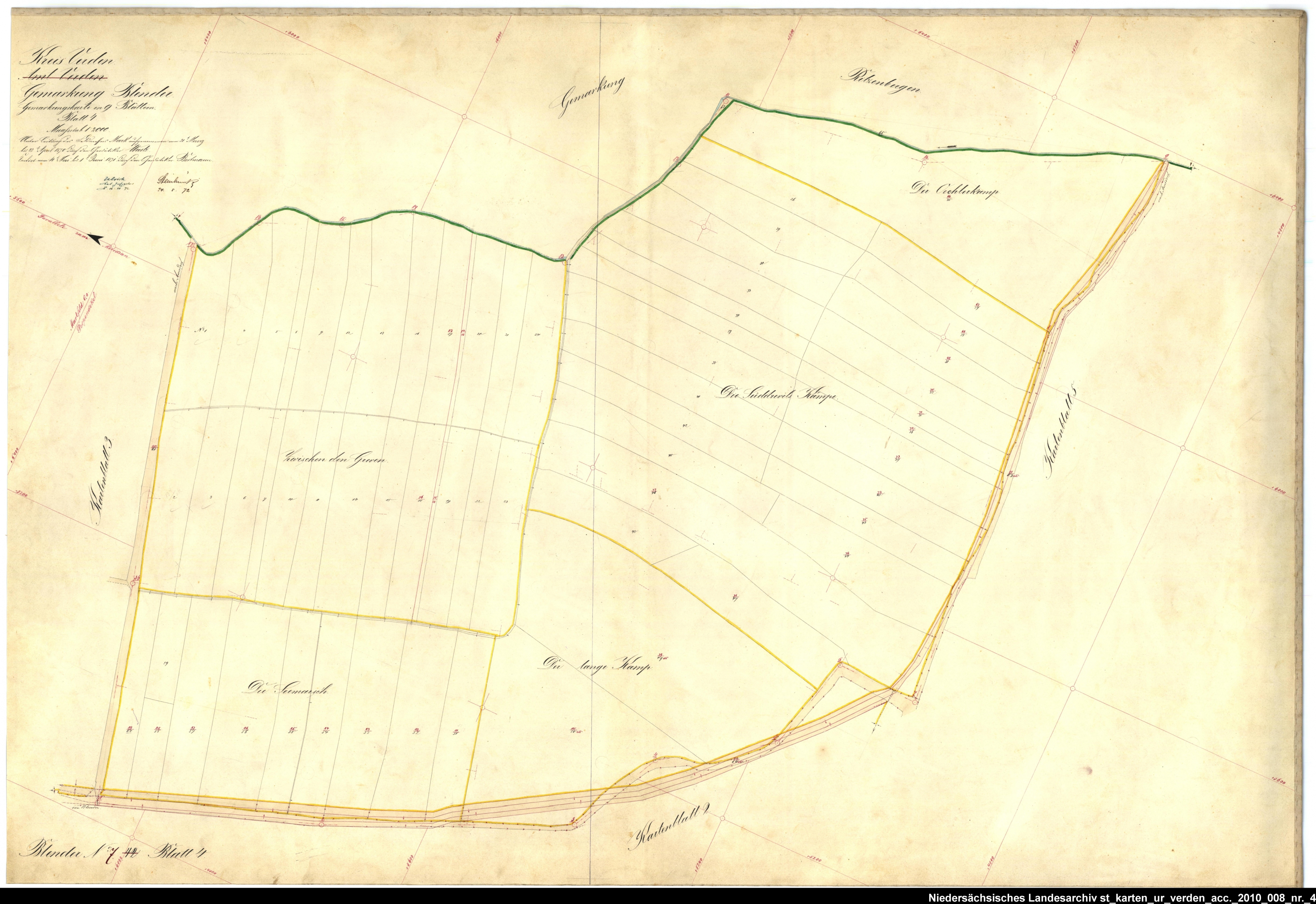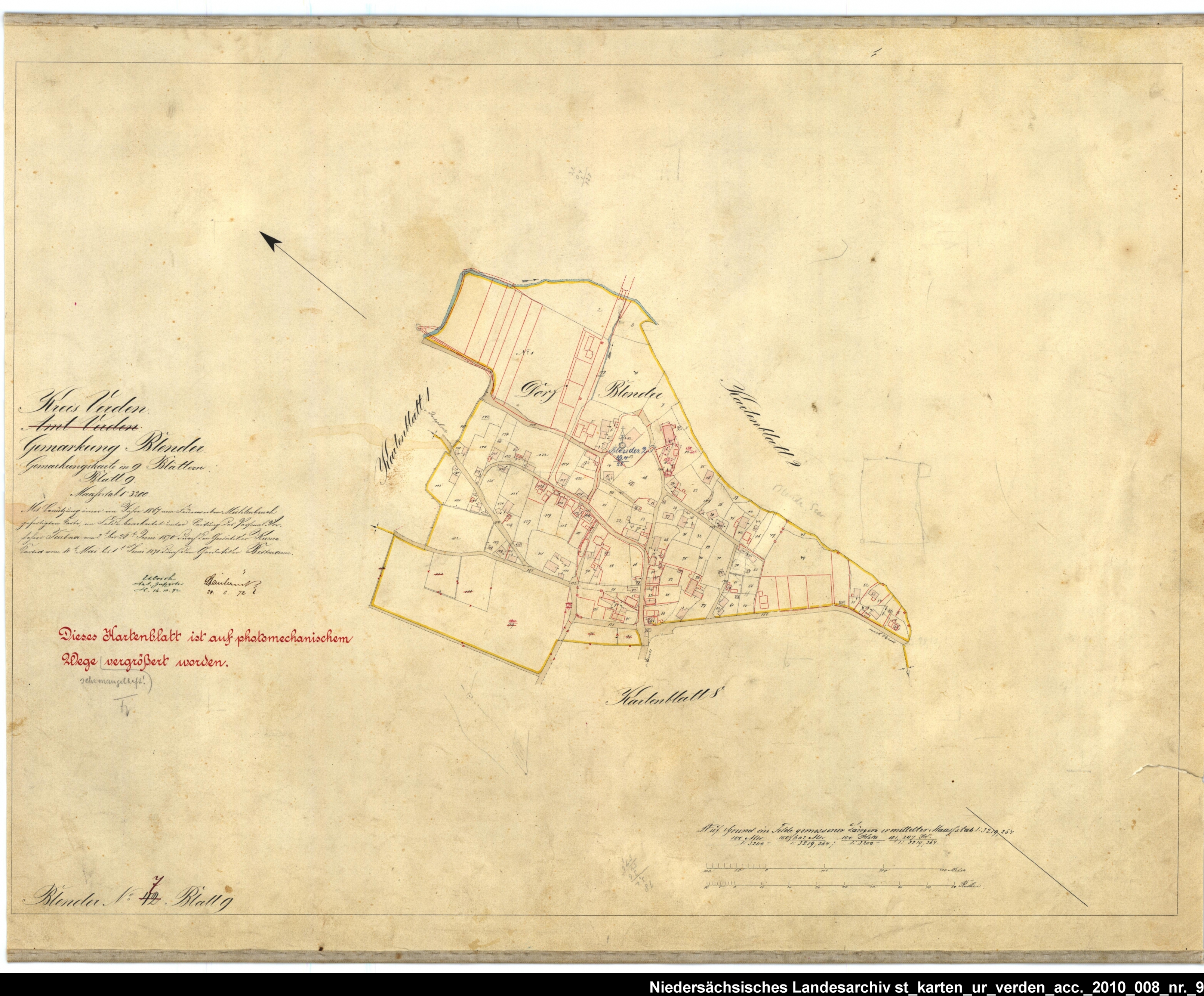 Es handelt sich um die Urkarte des Katasteramtes Verden (zugehörig zur GLL Verden, jetzt LGLN – Regionaldirektion Verden). Die einzelnen Blätter wurden vom 21. März bis 22. April 1870 erstellt. Zur besseren Zuordnung der einzelnen Blätter habe ich die entsprechende Gebiete auf einer älteren Übersichtskarte markiert.